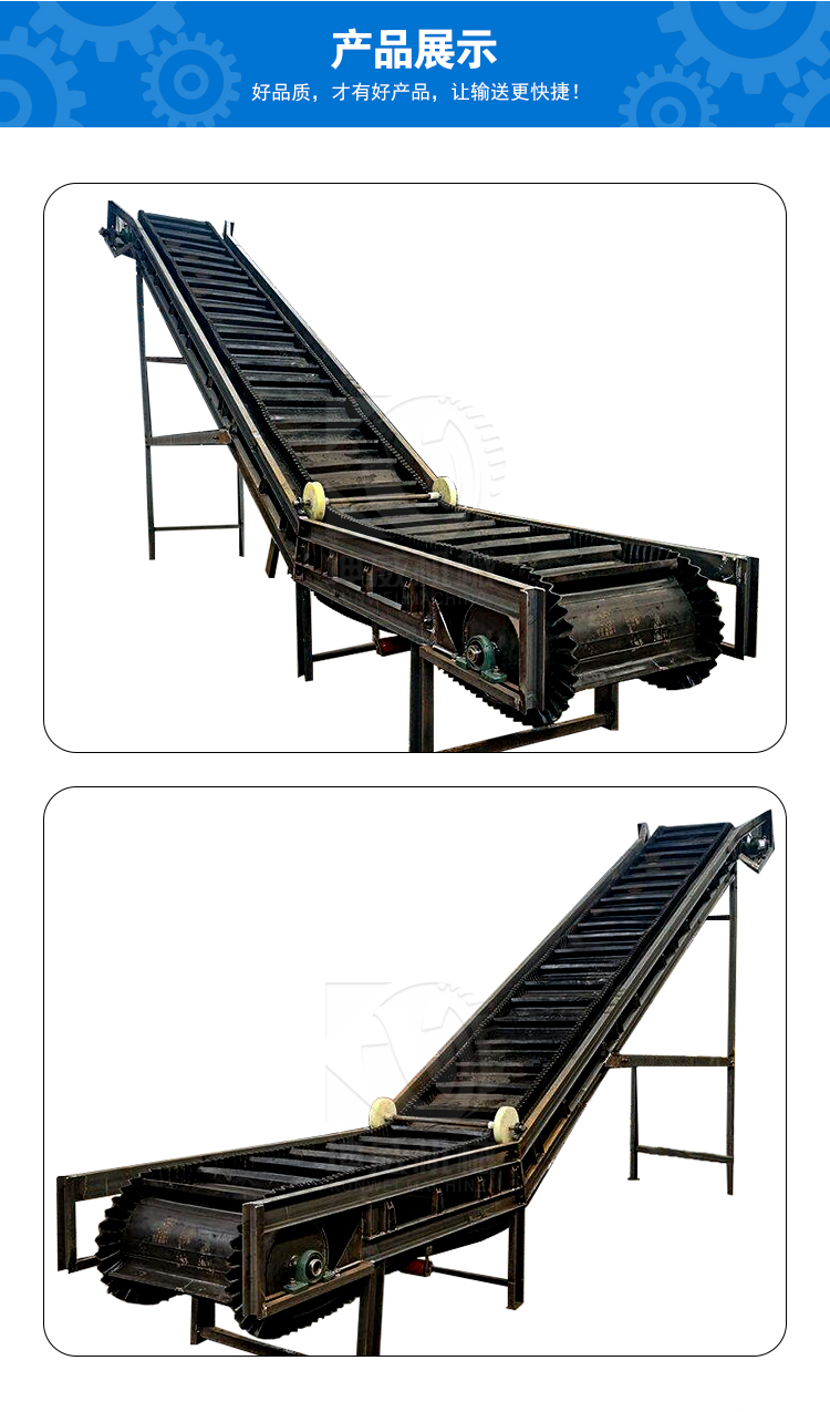 大傾角皮帶輸送機 依靠其特有的優(yōu)勢,在企業(yè)中的使用越來越普遍,在提升高度相同的情況下,所占地面和空間少,并且具有常規(guī)帶式輸送機的所有特點,投資成本低,因而在生產(chǎn)運輸
