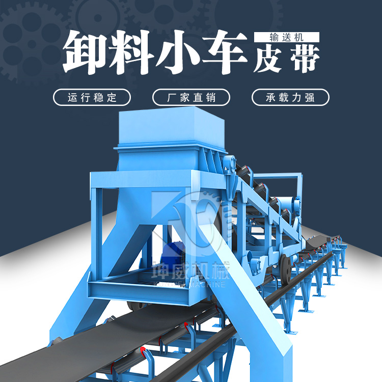 卸料車(chē)主要由車(chē)架、滾筒組、托輥組、驅(qū)動(dòng)裝置、行輪組、漏斗等組成。